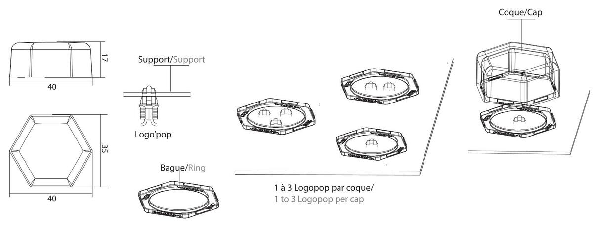 Créativité sans limite pour le point lumineux.L’alliance des coques Domino avec les led Logo’pop permet de choisir parmi plusieurs formes et couleurs de capsules translucides ou diffusantes, de un à trois modules par capsule, afin de varier les intensités lumineuses.
